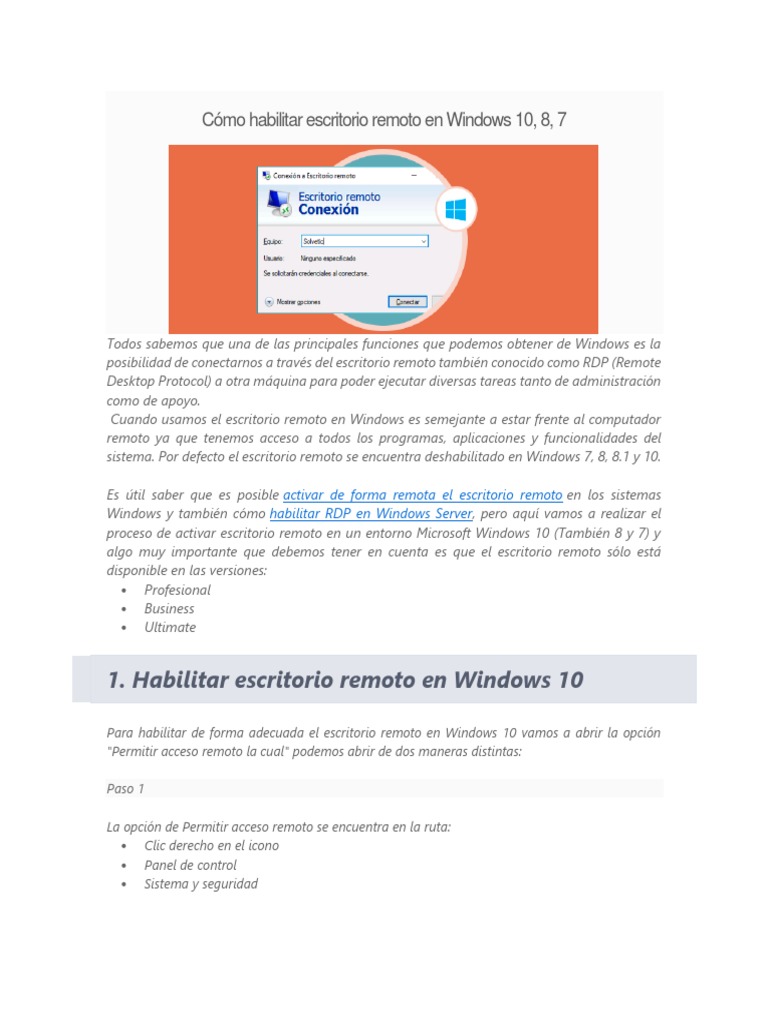La función de escritorio remoto de Windows debe estar habilitada al ordenador al que nos queremos conectar. Escritorio Remoto es una aplicación desarrollada por Microsoft e instalada por defecto en Windows (menos Por motivos de seguridad, esta función viene desactivada por defecto en todas las versiones de Windows por lo que si queremos hacer uso de ella debemos activarla manualmente para poder. Lo primero que debes hacer es configurar el ordenador que "ACTUALIZADO ✅ ¿Necesitas conocer la definición de escritorio remoto y los mejores proveedores para Windows y Mac? ⭐ ENTRA AQUÍ ⭐.