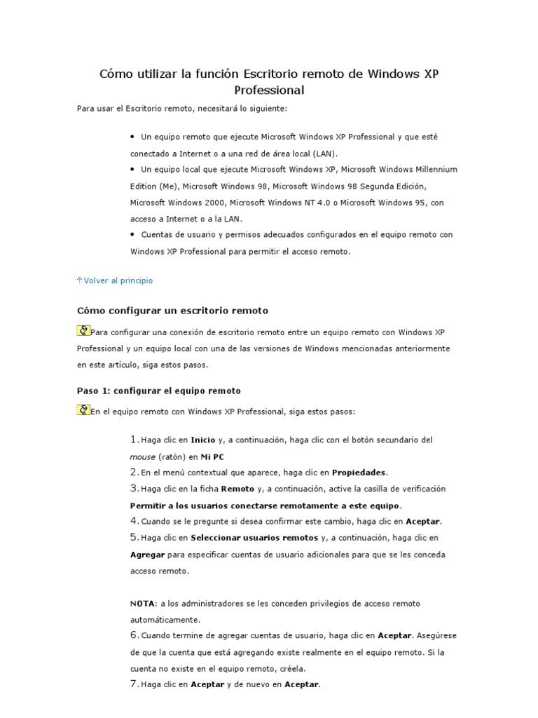 Escritorio Remoto Windows Xp. Una vez activada, tendrás que bajarte la aplicación de. Configura el PC al que quieres conectarte para que permita conexiones remotas Requisitos para activar Escritorio Remoto en Windows XP.